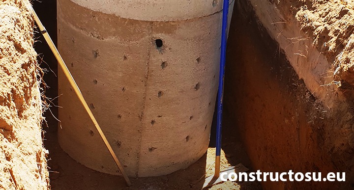 Ultimul inel și capacul acestui bazin trebuie poziționate sub adâncimea de îngheț al solului. Calculați bine capacitatea, adâncimea săpături, numărul de inele, modalitatea de a le coborâ acolo, etc. Înainte să trecem la următorul pas, nu uitați că în acest bazin se va scurge și apa provenită din sistemul de drenaj. De fapt, de acolo va proveni majoritea apei, după ce construcțiile sunt terminate. Bazinul în sine nu drenează apă din sol. El utilizează niște baghete din tub de PVC cu un filtru de geotextil, ușor de confecționat în regim DIY. Pentru aceste tuburi de drenaj, aveți nevoie de găuri suficient de mari, în inele perforate.