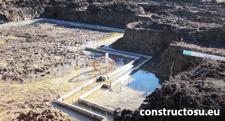 În imaginea de mai sus avem o situație care ne arată ce se întâmplă când nu avem bazinul temporar de colectare a apei din sol, dar care ne ajută să înțelegem și cantitatea de apă care s-ar putea strânge în spațiul în care trebuie să construim. În acel loc ar fi trebuit turnată talpa fundației pe perimetrul cofrajului pe care îl puteți observa. Dimineața, când betoniera cu malaxor a sosit, constructorul a avut surpriza că nu poate turna betonul pentru că nu are unde, totul fiind inundat și noroios. Betonul a fost pierdut, iar lucrările sistate temporar.