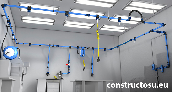 Sună destul de complex, însă nouă ne trebuie o țeavă de presiune de la compresor, sau de la camera compresorului, sau de la rezervorul de aer comprimat, pe care o ducem la locul unde urmează să utilizăm aerul. Acest loc este de regulă mediul de producție, hala, fabrica, containerul, camera de sablare, etc. Și aici țeava de transport a aerului comprimat întâlnește sistemul de distribuție. Țeava de transport al aerului comprimat, nu trebuie să fie prea groasă. Totul depinde de debitul de aer pe care îl utilizați. Această țeavă de transport are uneori sute de metri, alteori jumătate de metru.